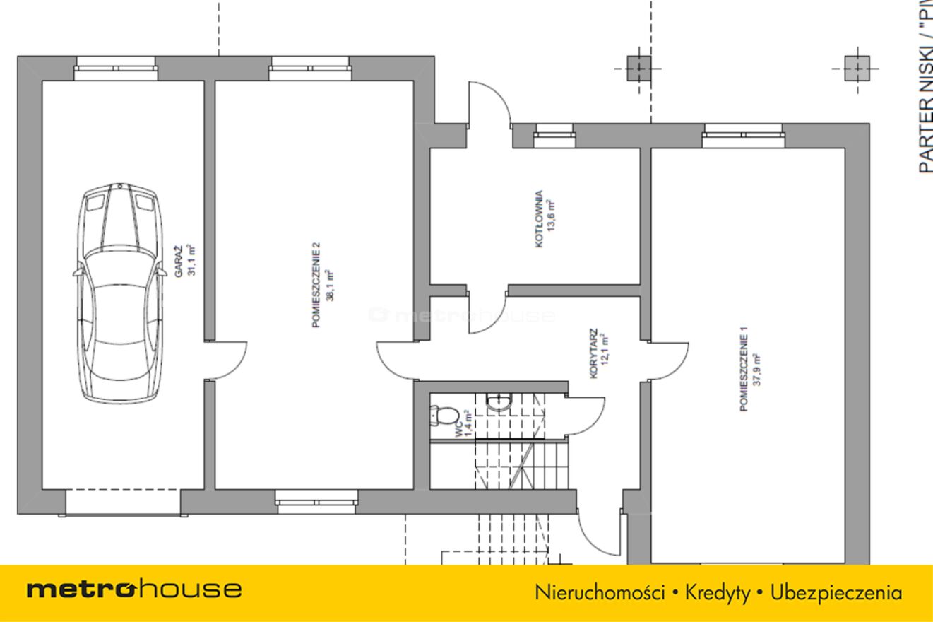 Niski parter z osobnym wejściem od zewnątrz i wyjściem na ogród, poza pomieszczeniami gospodarczymi na kotłownię, wc i garaż składa się z dwóch okazałych przestrzeni, które mogą posłużyć za warsztat, magazyn, miejsce na siłownię lub inną aktywność nowego nabywcy.