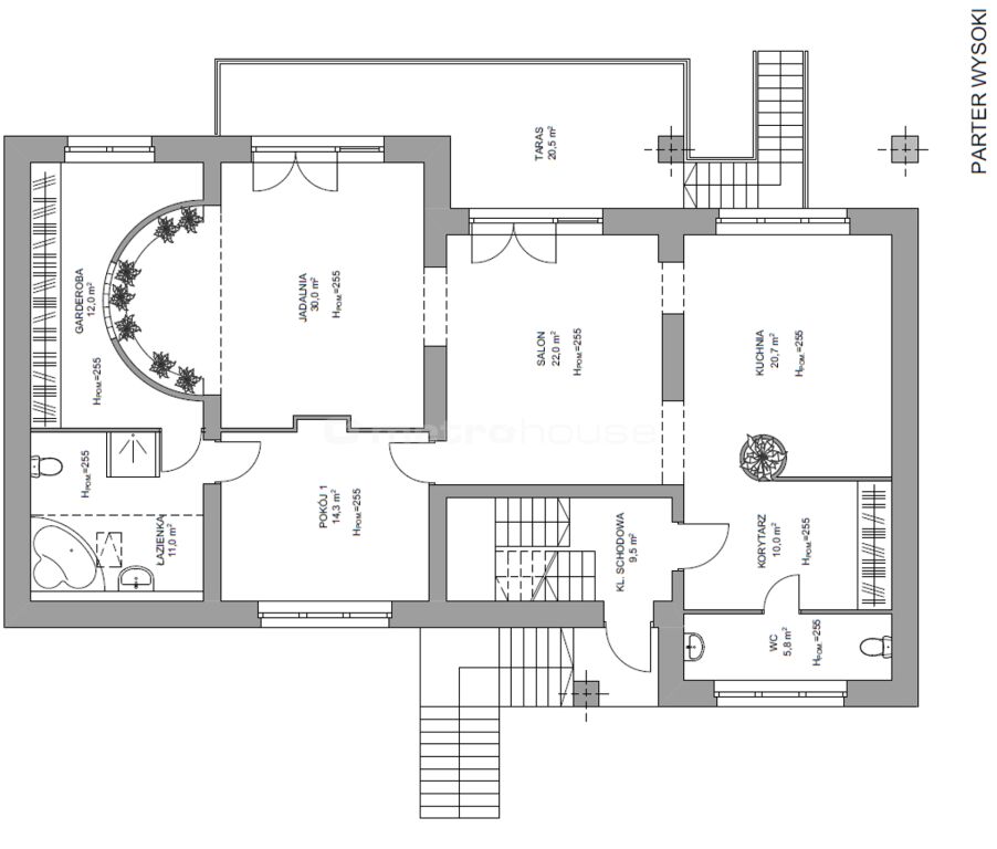 Na wysokim parterze znajduje się serce domu- duża, wygodna i funkcjonalna kuchnia, połączona z pokojem dziennym z wyjściem na taras i dodatkowym, przestronnym salonem. Tę przestrzeń można według potrzeb przebudować na sypialnie lub funkcjonalne pokoje. Na tym poziomie również znajdziemy sypialnię z imponującą garderobą oraz łazienką główną, a także toaletę dla gości.